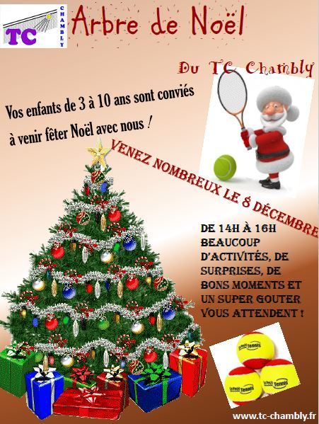 Tous les enfants du club agés de 3 à 10 ans sont invités à un grand moment de joie et de partage autour de l'arbre de Noël au tennis club de Chambly de 14h à 16h.