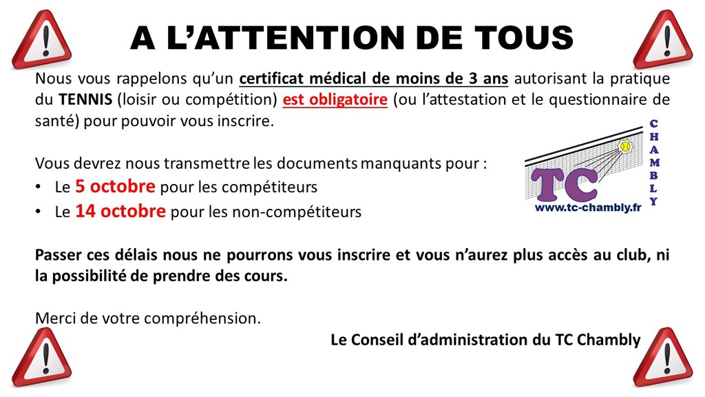 Certificat médical, questionnaire de santé, attestation Pensez à les ramener au club